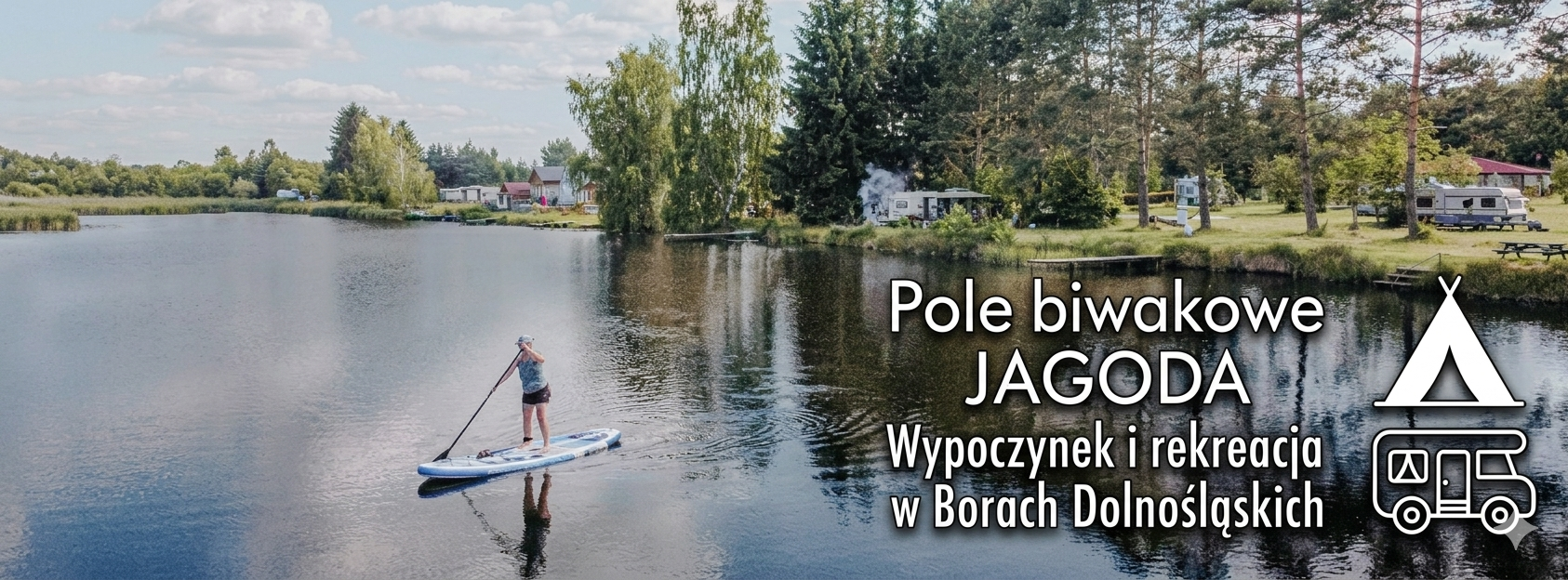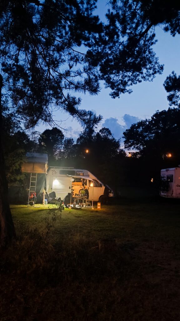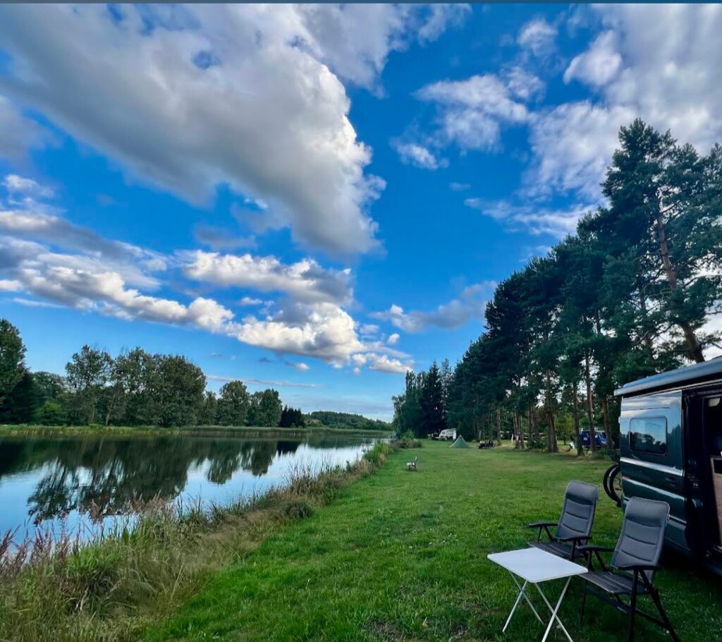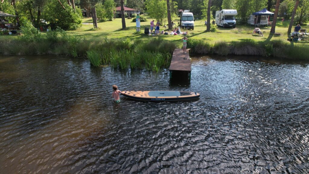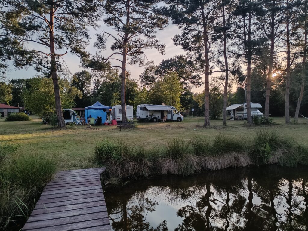 Dysponujemy polem biwakowym z przyłączem elektrycznym i widokiem na wodę. Na terenie ośrodka znajdują się również zadaszone wiaty (w tym jedna z kuchnią i grillem do dyspozycji letników), plac zabaw, sanitariaty, pole do siatkówki plażowej i mnóstwo zielonej trawy do biegania na boso 😉